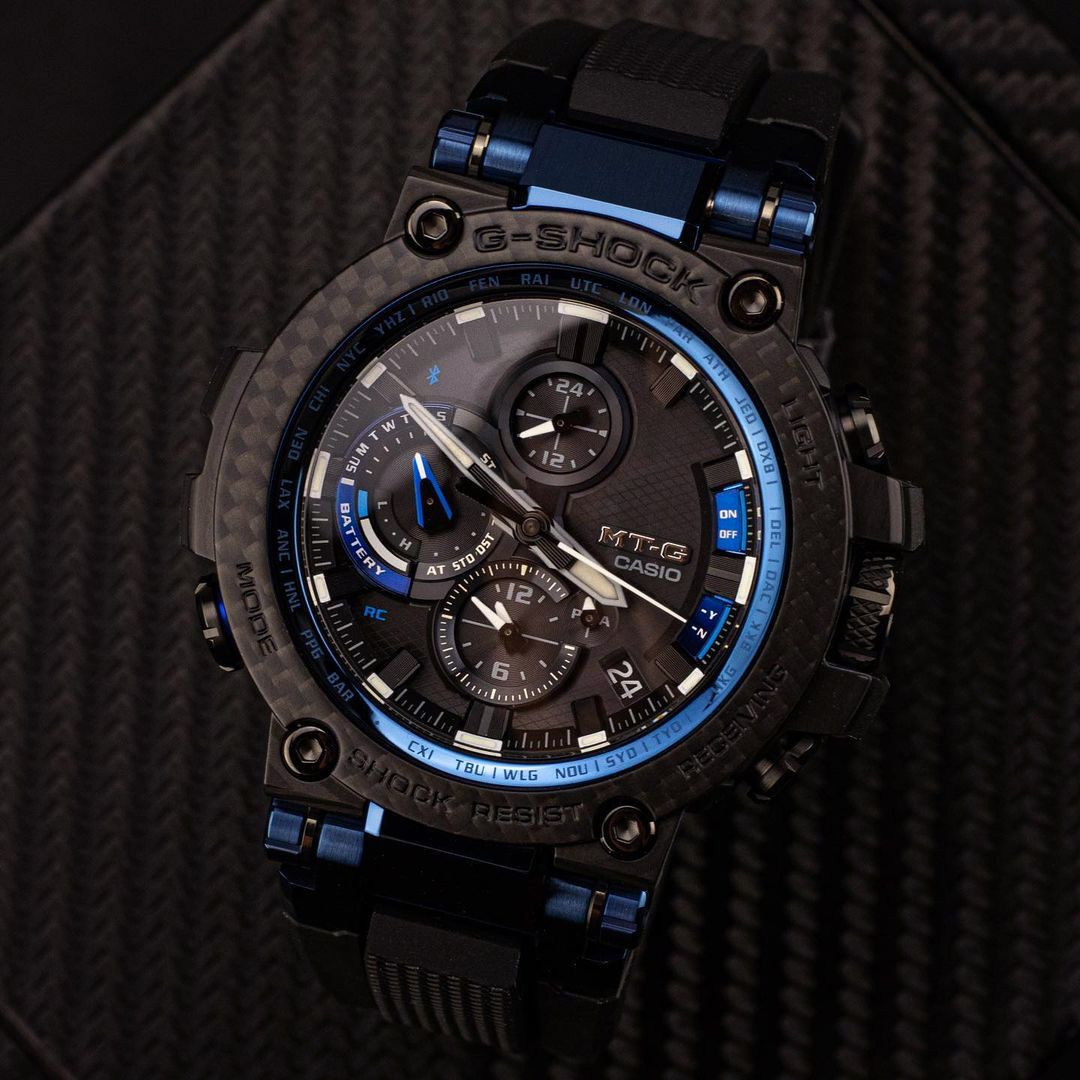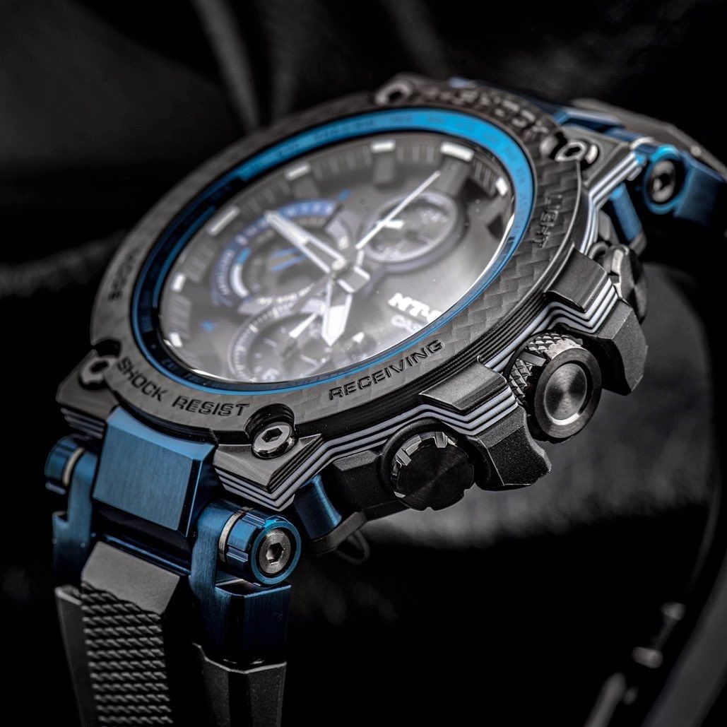 Релиз конца 2019 года от Casio в серии MTG-B1000. Модель в черном стальном корпусе с синими деталями циферблата обладает карбоновым фактурным безелем, полимерным ремешком и новым супер-стильным дизайном с переосмысленной структурой корпуса, из-за чего получилось сделать его более компактным и тонким, нежели предыдущие поколения серии MTG. Полимерная часть корпуса дополнительно усилена карбоновыми волокнами и, при взгляде на профиль часов, имеет слоистую черно-белую текстуру.
