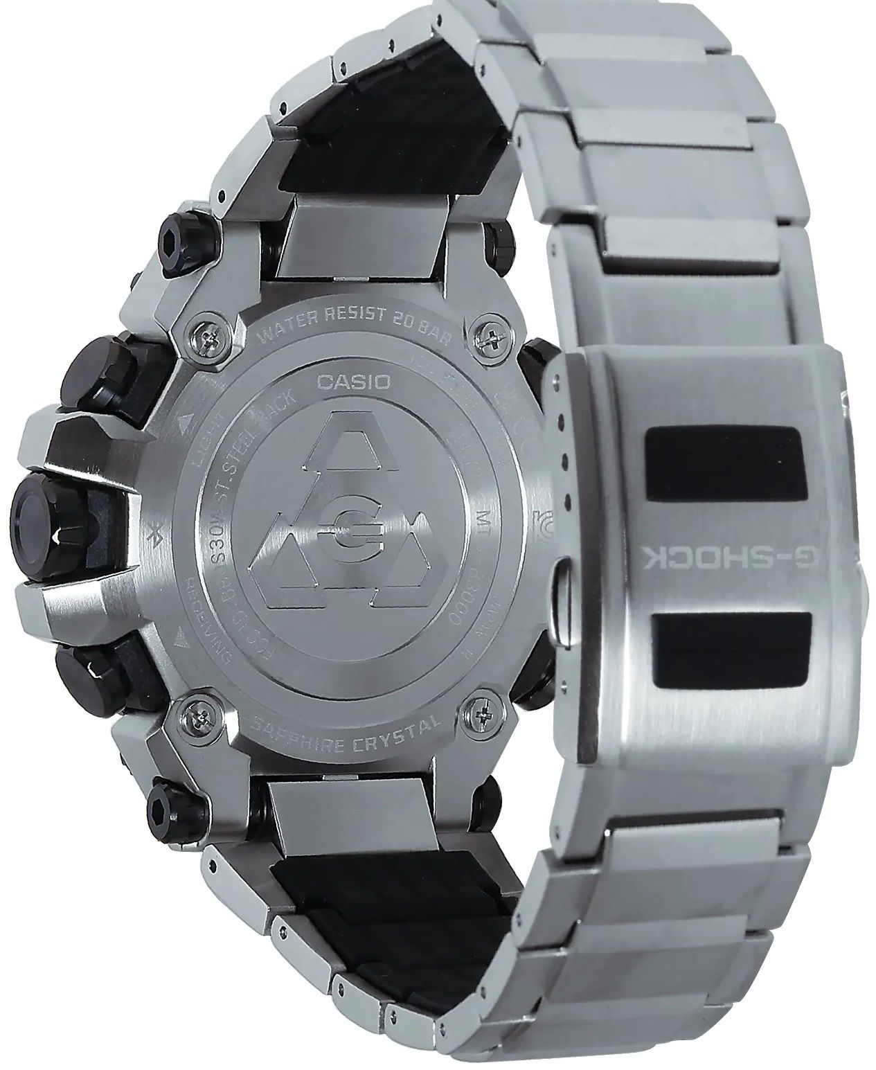Отдельно стоит отметить инженерное решение задней крышки часов, она является одним целым с боковыми защитными наплывами корпуса. Таким образом корпус лишился полимерной прослойки, которая была у моделей MTG-B1000, но и не является цельно металлическим, как у моделей MTG-B2000, сверху модуль покрывает стальной безель, а сбоку и сзади его защищает цельная металлическая оболочка черного цвета, являющаяся задней крышкой часов.
