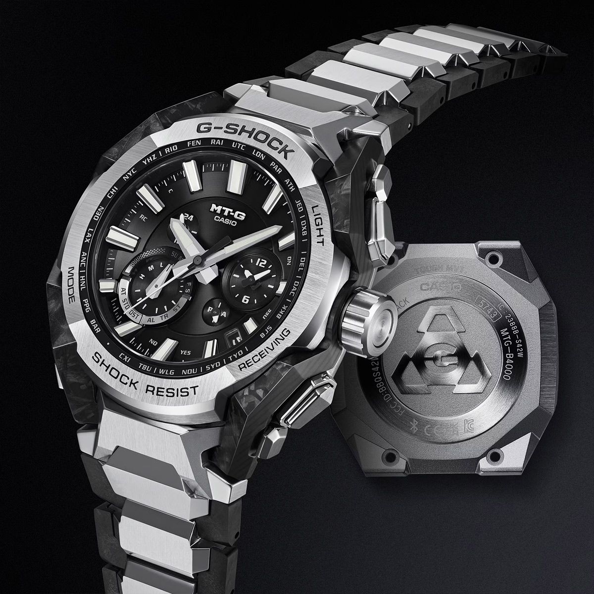 Сложный объемный каркас часов выполнен из ламинированных листов карбона и стекловолокна, создавая необычный многослойный рисунок по краям корпуса. Стальные части безеля получили комбинированную обработку высочайшего уровня, совмещая зеркальные поверхности с изысканным текстурным сатинированием. Отдельно стоит упомянуть необычный композитный браслет часов, внешний вид которого отличается от всего, что мы видели на моделях G-Shock MTG ранее, отлично дополняя собой футуристичный вид часов.