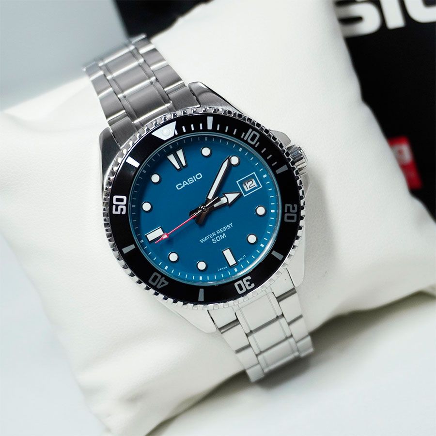 Компактный трехстрелочник из коллекции CASIO CLASSIC в круглом стальном корпусе с алюминиевым безелем с односторонним вращением и сине-зеленым циферблатом с красной секундной стрелкой, покрытым прочным минеральным стеклом, станет отличным выбором в качестве модели на каждый день или аксессуаром, который будет приковывать к себе взгляды окружающих, гармонично дополняя собой любой ваш образ.