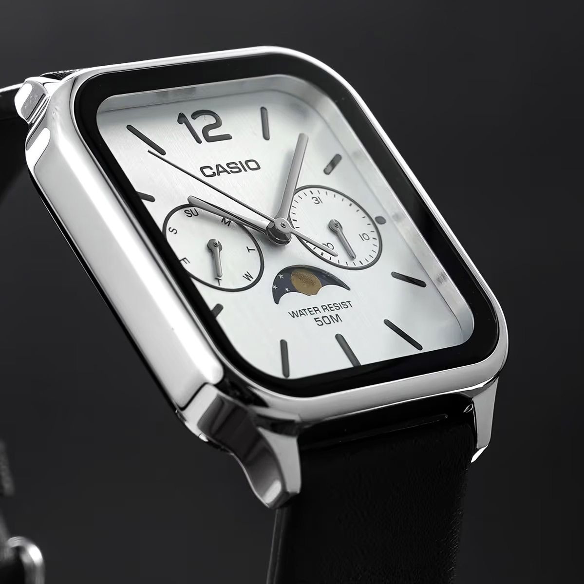 Часы представлены на черном кожаном ремешке, на субциферблатах отображают текущую дату и день недели, а также имеют небольшую влагостойкость в 5 Бар.