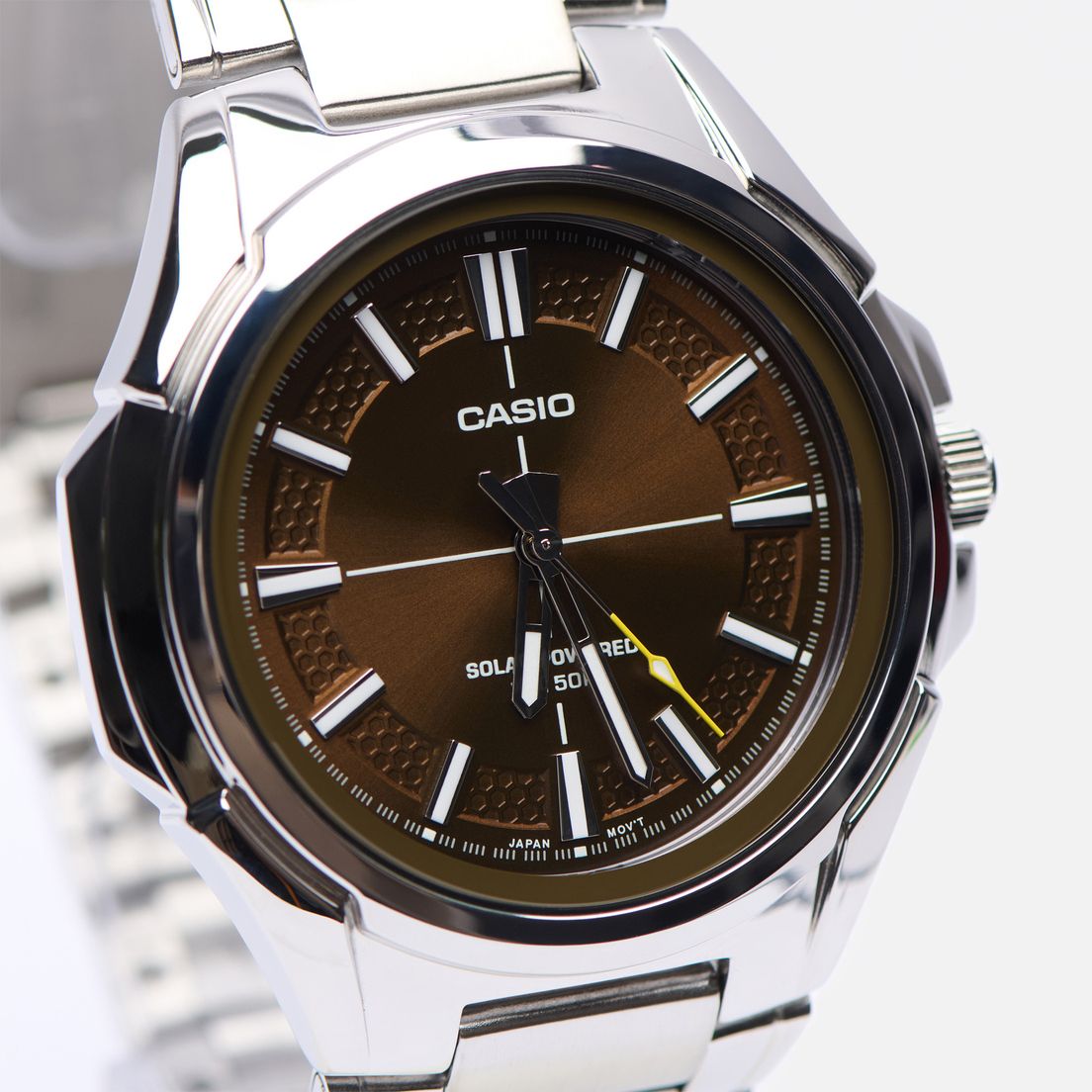Часы представлены на стальном браслете и имеют на борту солнечную батарею,
