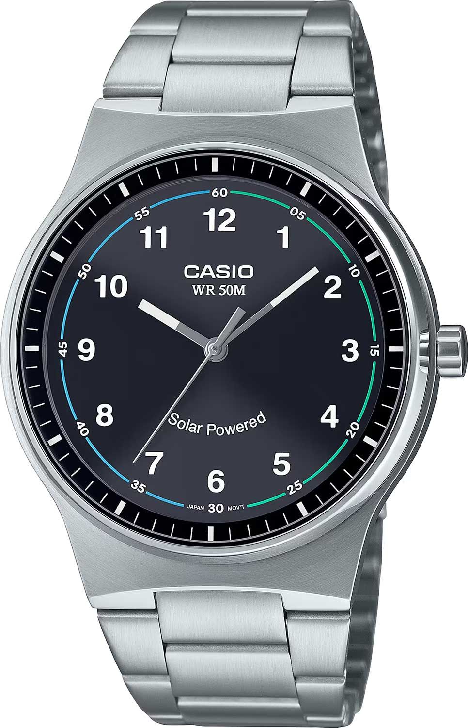 Часы представлены на стальном браслете и имеют на борту солнечную батарею,