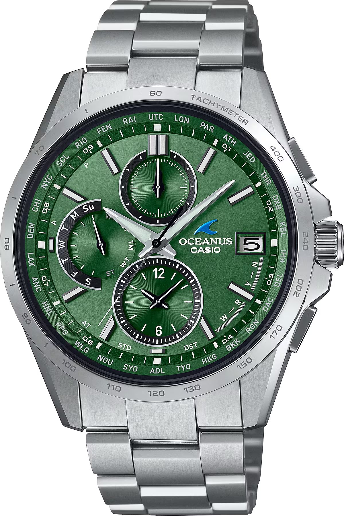 модель из линейки «OCEANUS Classic» оснащена безелем с тахиметрической шкалой, что придает ей спортивный вид, и имеет циферблат насыщенного зеленого цвета с нанесенным методом ионного напыления.