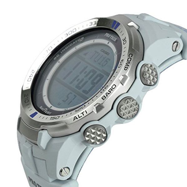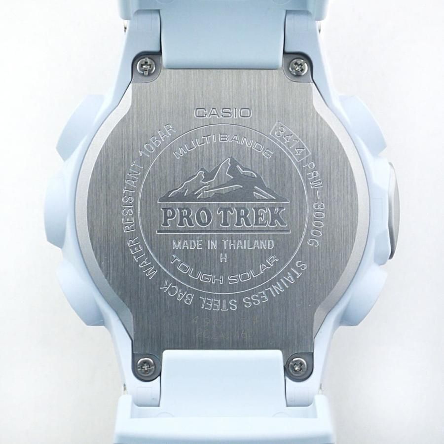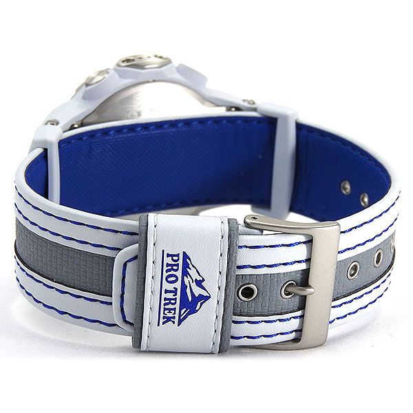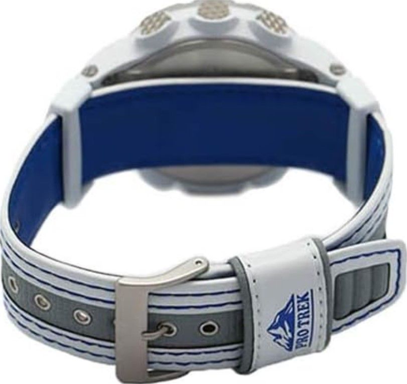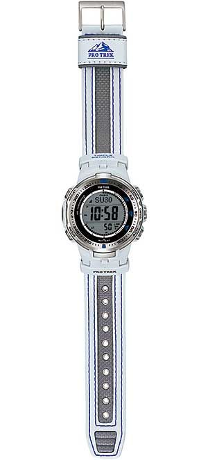 PRW-3000G с кожаным, сплошным бело-синим ремешком, в комплекте тканевый сменный ремешок.