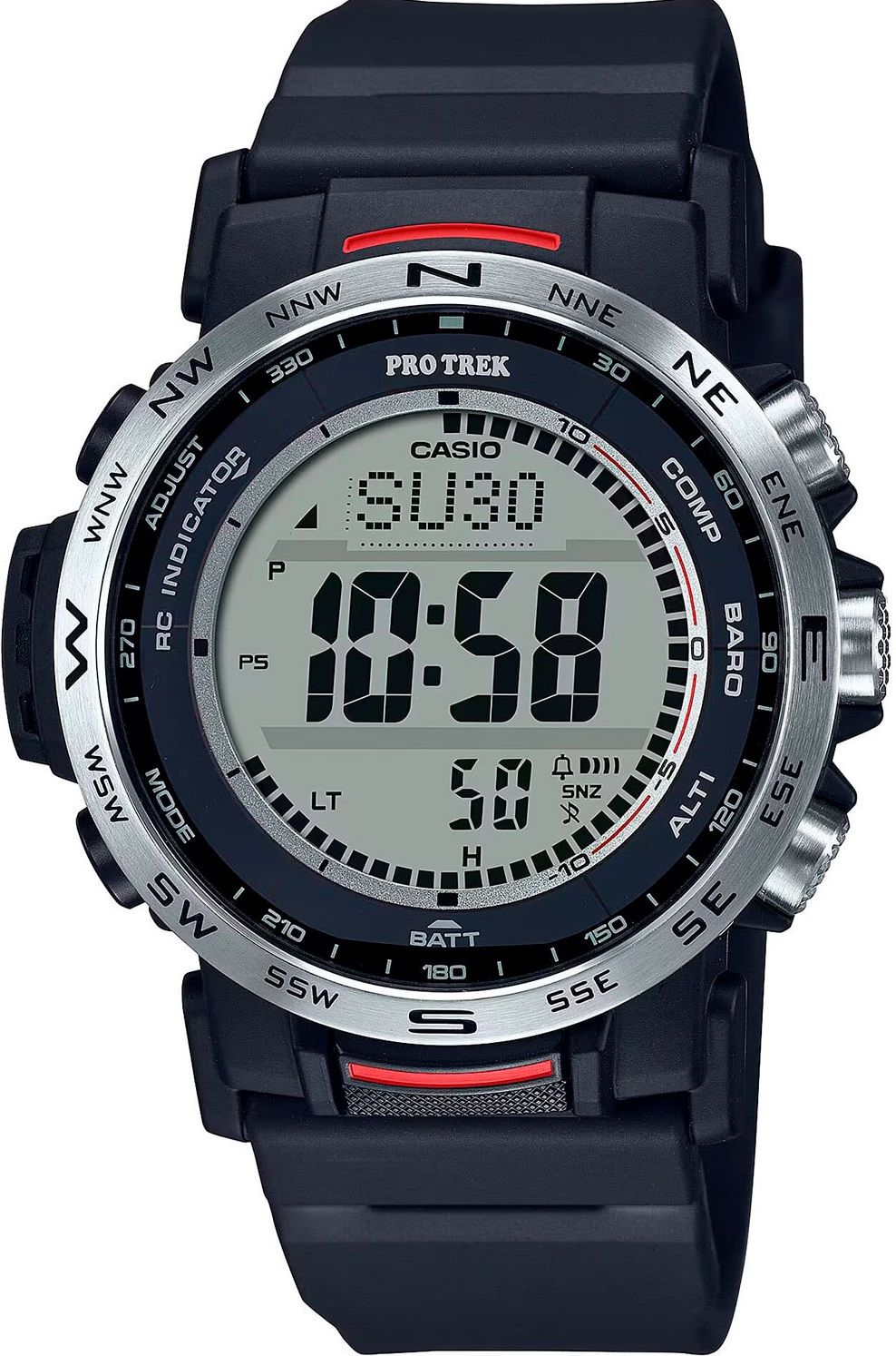 Узнаваемый стальной безель с отметками для компаса — полезная штука во время пешего туризма и кемпинга. Еще со времен PRW-30 он стал намного тоньше, чем у более ранних PROTREK-ов, за счет чего STN LCD дисплей стал крупнее [в соотношении к размеру корпуса].