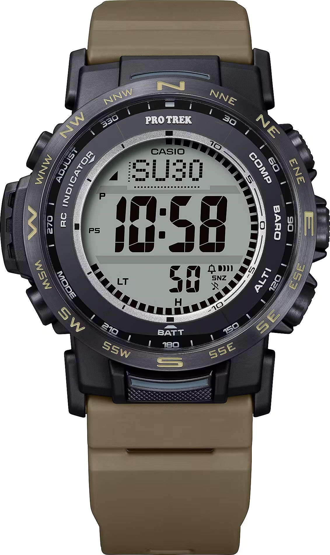 На борту модели вы найдете Triple Sensor (тройной датчик): термометр, барометр, высотомер, компас, а также данные о заходе и восходе Солнца, яркую автоматическую подсветку, а прочное минеральное стекло, окруженное стальным безелем, защищает циферблат от механических повреждений. Добавьте сюда солнечную батарею, радио-синхронизацию времени и водозащиту до 100 метров, чтобы быть уверенными, перед вами один из самых громких и востребованных релизов Casio в 2025 году!