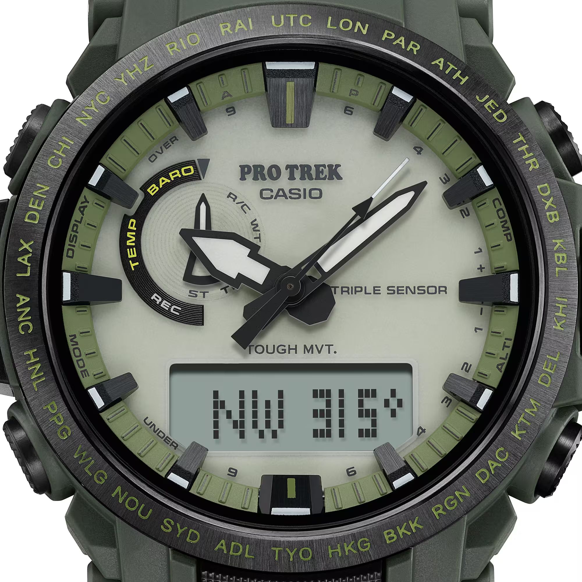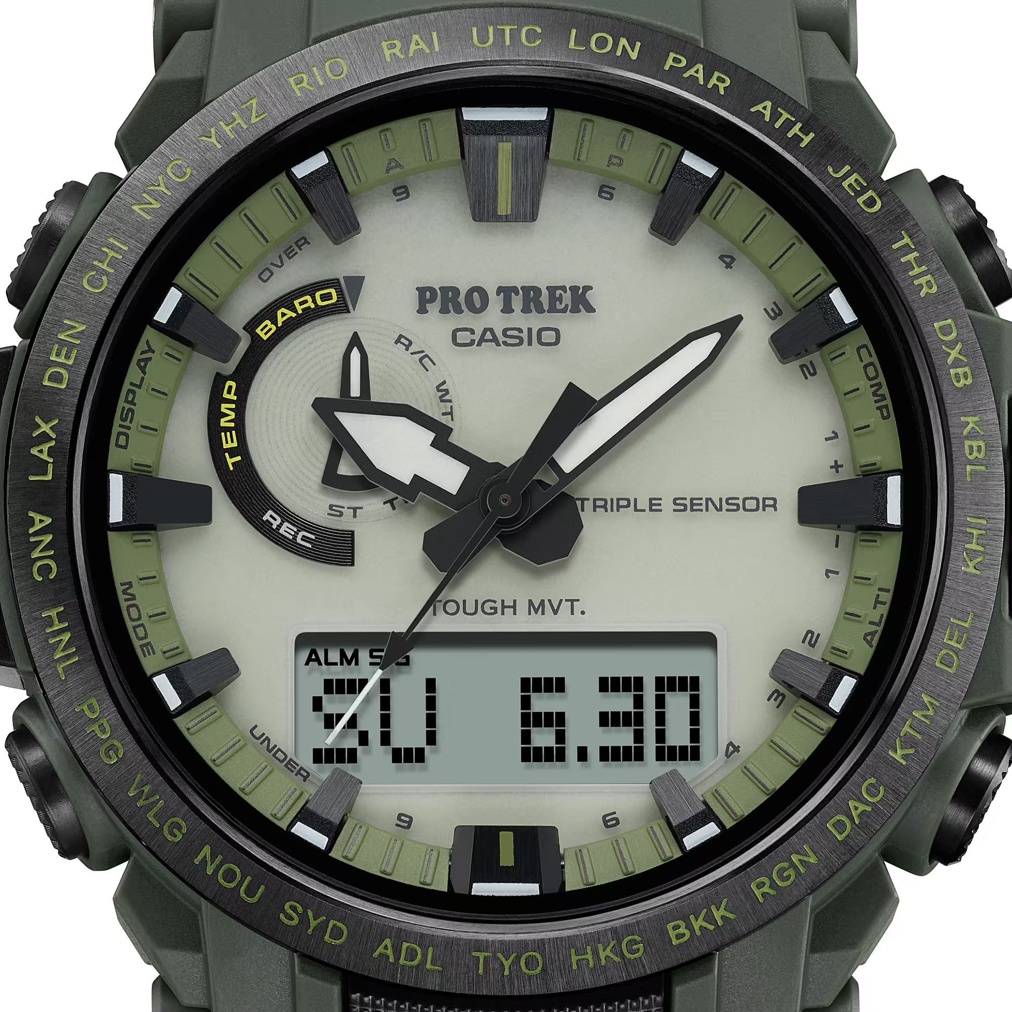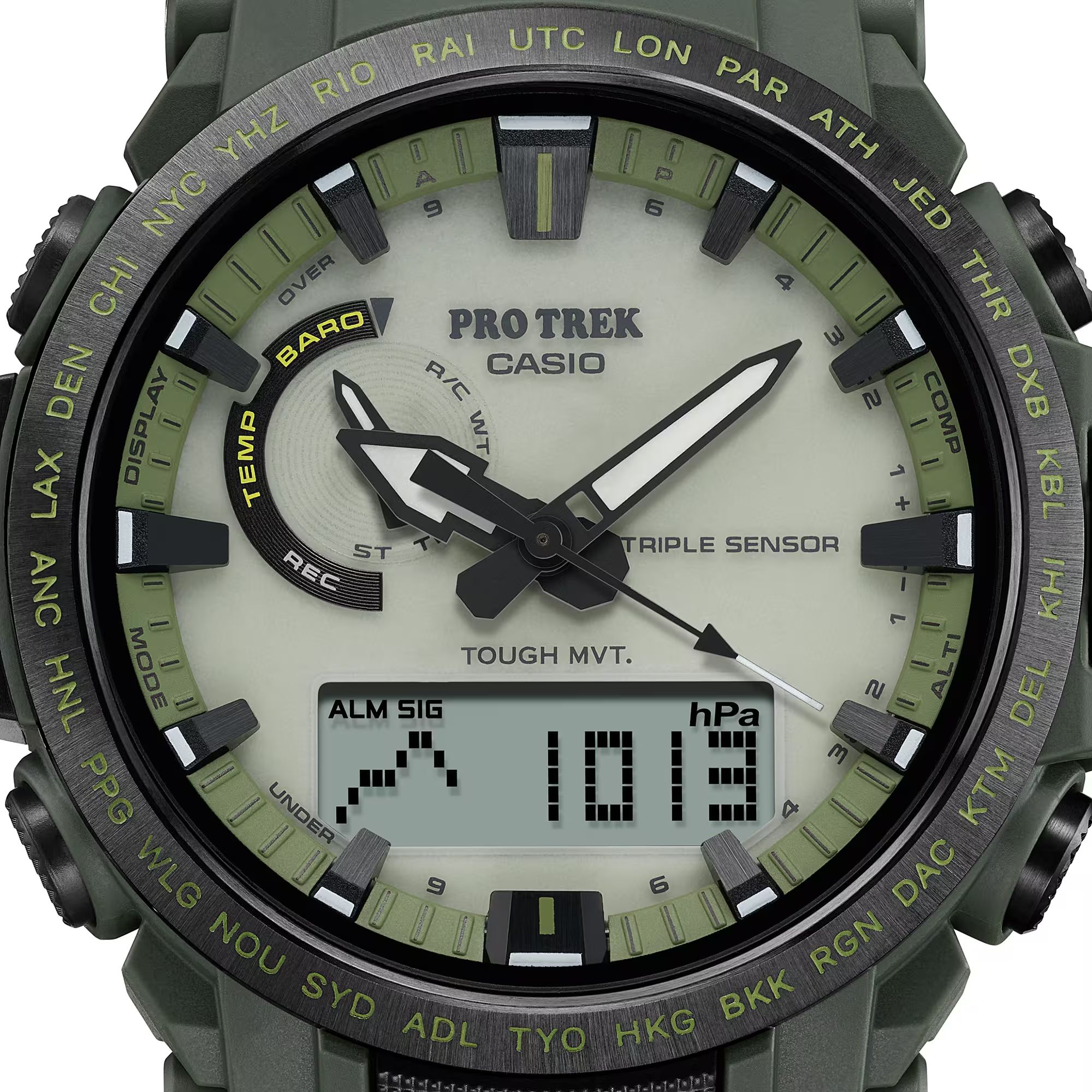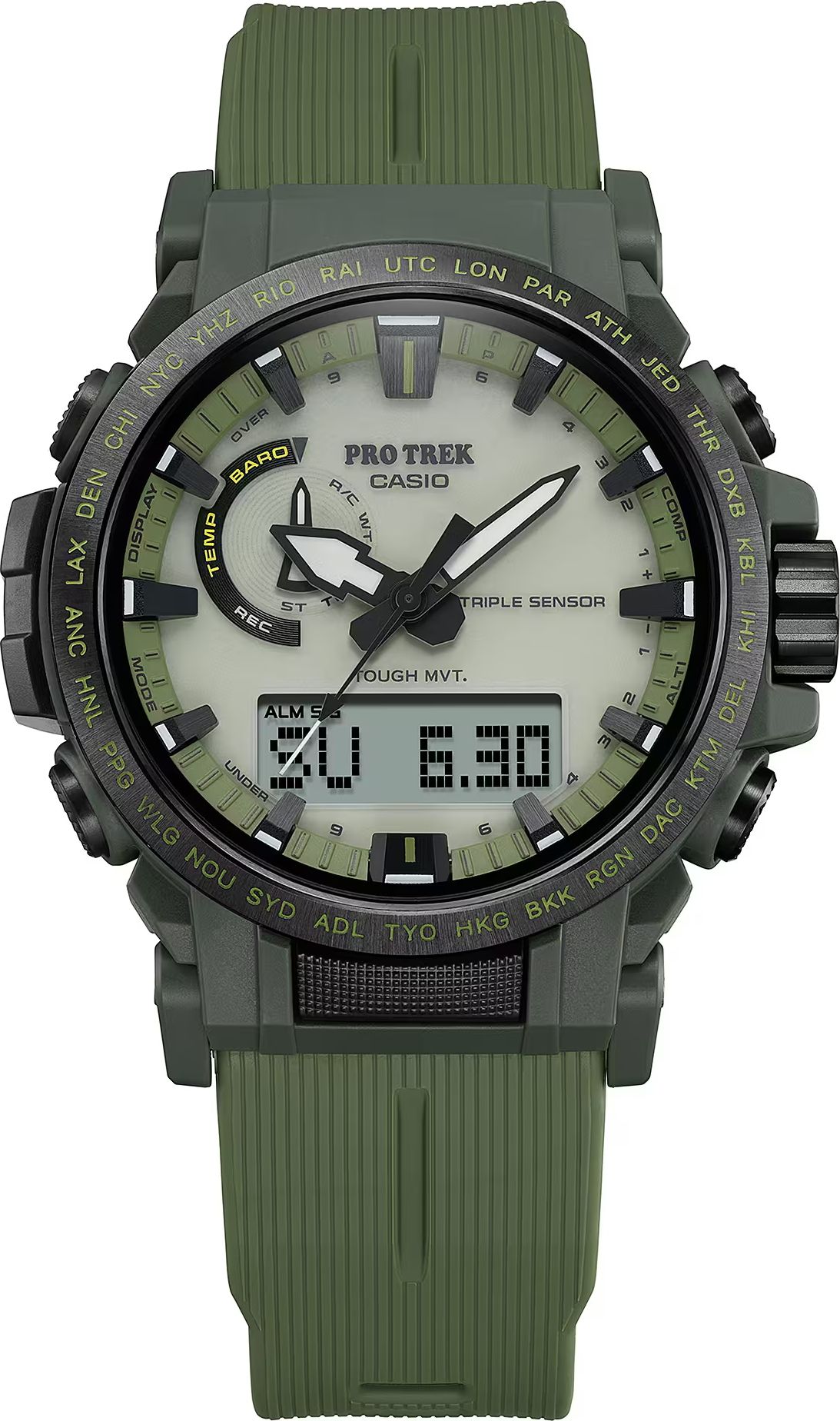 Перед вами релиз 2025 года — один из флагманов PRO TREK в зеленом корпусе PRW-61. Данные протреки на зеленом полимерном ремешке получили улучшенную структуру корпуса, более устойчивую к ударным нагрузкам и еще более эффективную солнечную батарею, чем их предшественники из знаменитой серии PRW-6000. Особенностью модели является светлый циферблат, полностью покрытый необрайтовым, светящимся в темноте составом. Это первые протреки с подобным циферблатом и уникальным видом в темное время суток.