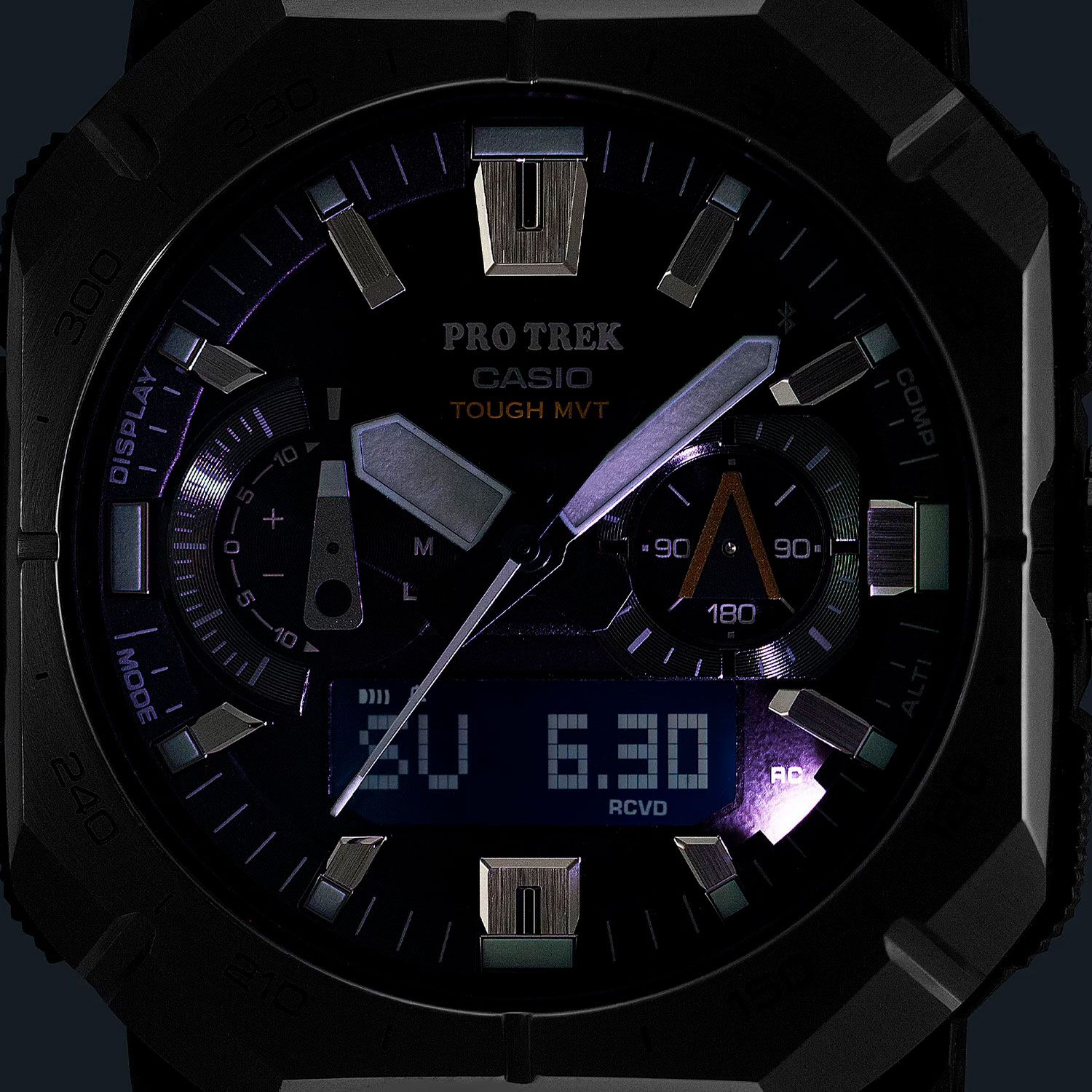 Под капотом у флагмана PRO TREK вы найдете тройной датчик в виде термометра, барометра, высотомера и цифрового компаса, график набора высоты, солнечную батарею, автоматическую радио-синхронизацию с атомными часами на разных континентах, сапфировое стекло с антибликом и еще более десятка часовых функций. Кроме этого PRW-B1000 отображают время восхода и заката и синхронизируются со смартфоном через Bluetooth®, позволяя удобно настраивать часы, автоматически актуализировать точное время и отображать метрики часов в удобном информативном виде в приложении CASIO WATCHES. Из интересных возможностей: часы можно использовать в качестве навигатора в связке со смартфоном, задав точку на карте, убрав телефон и часы по компасу будут вести вас к ней, указывая секундной стрелкой направление, а на дисплее отображая расстояние до неё. Стрелка у 9 часов показывает разницу в текущей высоте или атмосферном давлении (в зависимости от режима) с заранее заданной точкой на карте, а на дисплее есть индикатор резкого перепада давления, предвещающий резкую смену погоды.