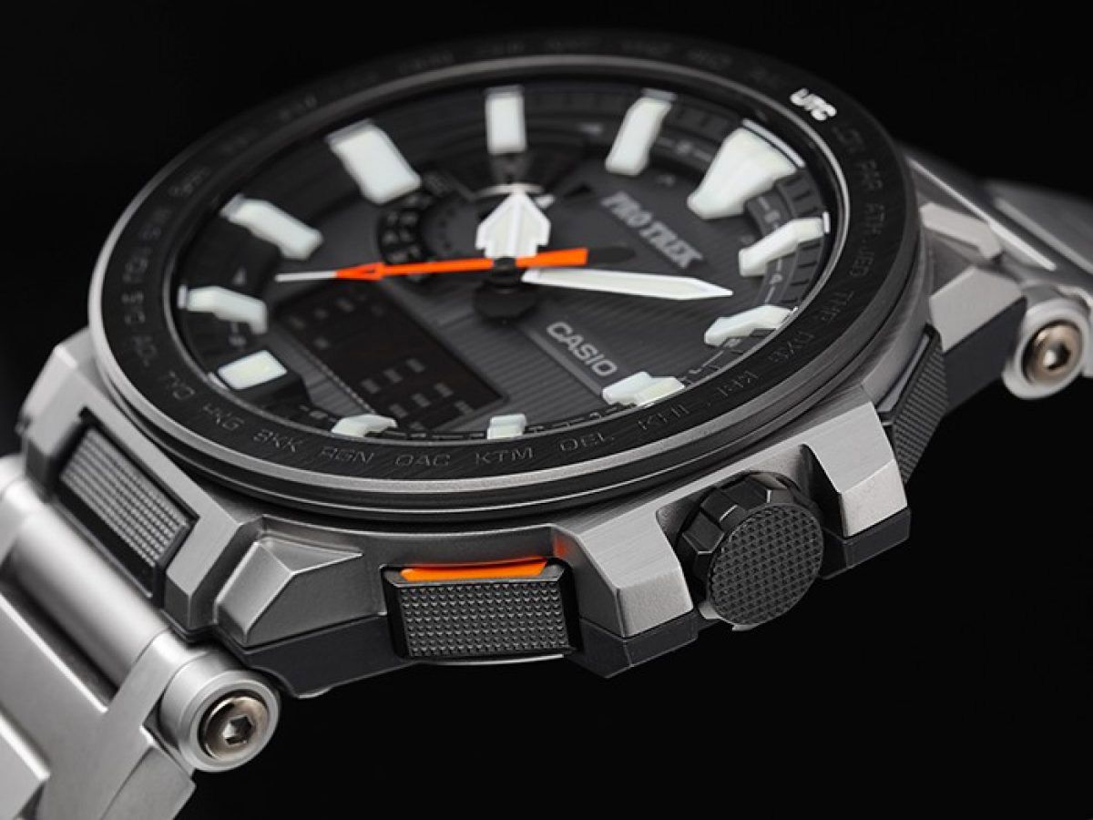 Редкая модель Pro Trek в корпусе PRX-8000. В металлических деталях корпуса и в браслете часов используется титан, а безель выполнен из стали с DLC покрытием.