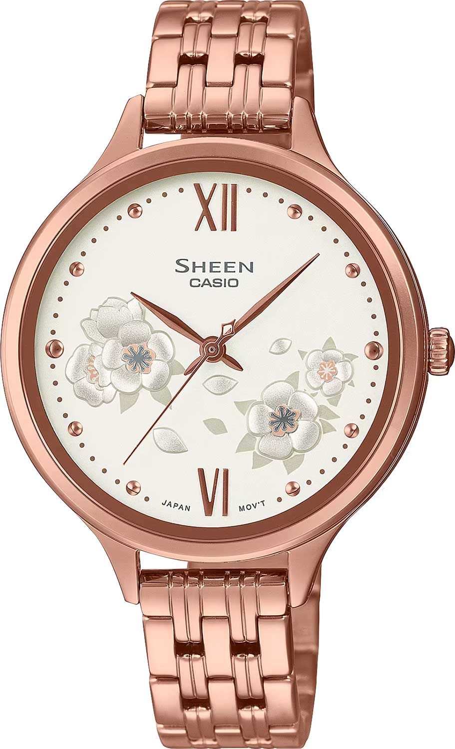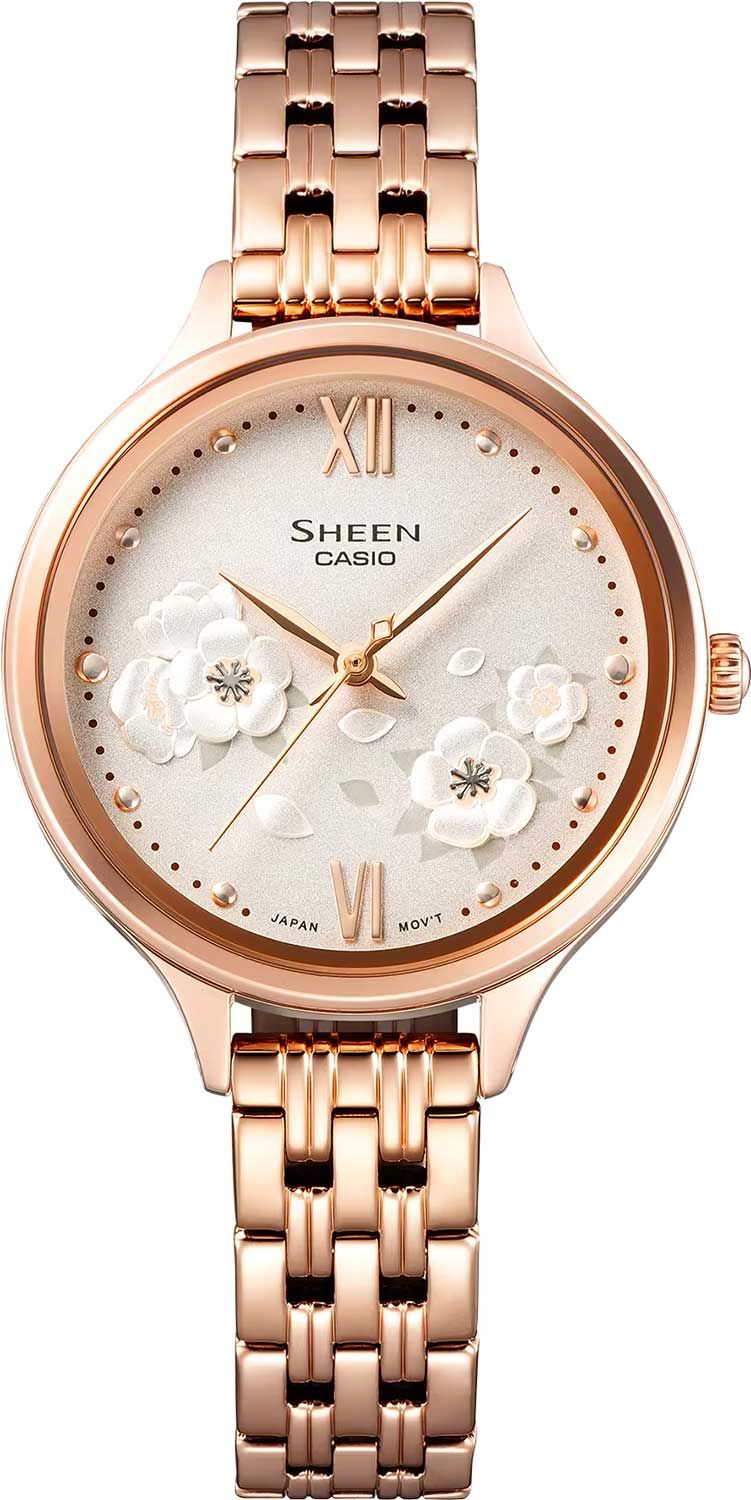 Стильная и лаконичная женская модель Casio Sheen 2023 года из 4000-й серии в классическом корпусе из высококачественной стали цвета розового золота на стальном браслете.