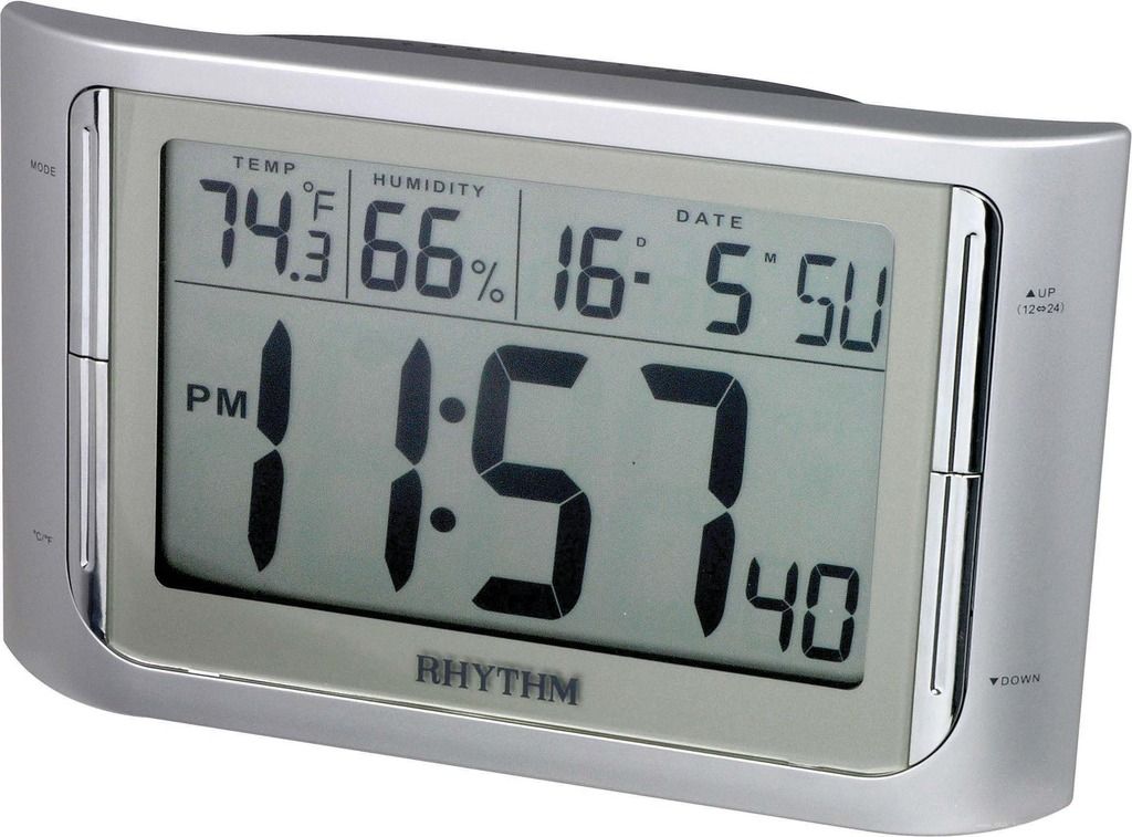 ПроизводительRhythmРазмещениенастольныеФормапрямоугольнаяМатериал корпусапластикЦвет корпусасеребристыйБудильникестьПодсветкаестьГигрометрестьТермометрестьКалендарьестьВысота11.5 см