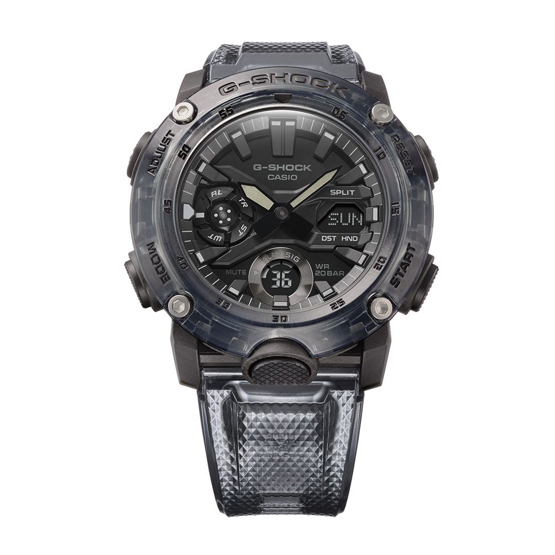 релиз 2021 года в корпусе GA-2000 в необычной полупрозрачной расцветке. В часах используется технология Carbon Core Guard: модуль часов защищает легкий и сверх-прочный полиуретановый корпус с углеродным армированием, а циферблат покрыт закаленным минеральным стеклом. Еще одна особенность часов — обновленное крепление ремешка, теперь его смена займет у вас всего несколько секунд.