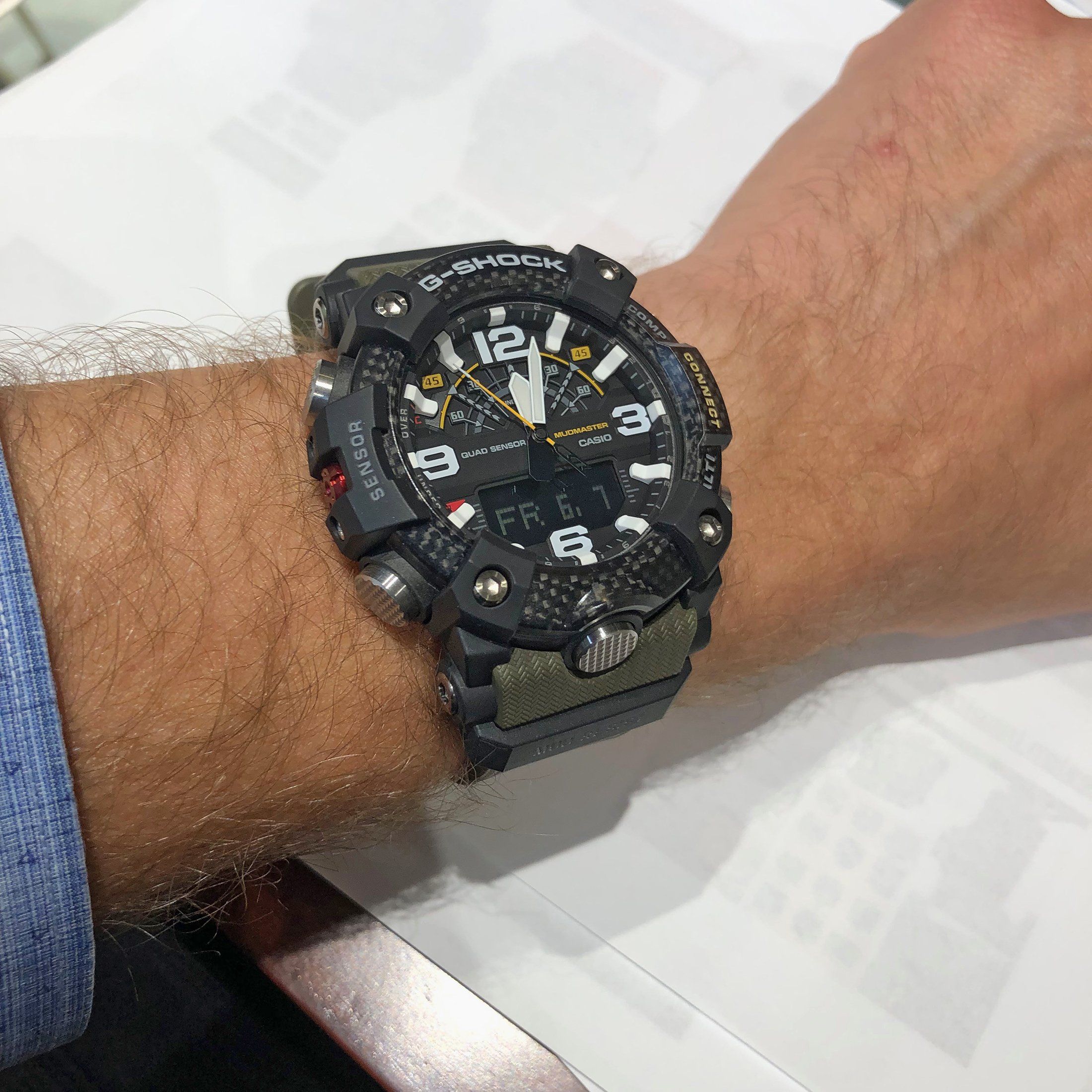 релиз выставки Baselworld 2019 года из серии G-SHOCK MUDMASTER в темном корпусе на ремешке цвета хаки. Эта модель в корпусе GG-B100 продолжает "карбоновый тренд" Casio 2019 года: именно из карбона выполнен корпус часов, защищающий новый механизм, а карбоновый безель дополнительно покрыт слоем прозрачного полимера.