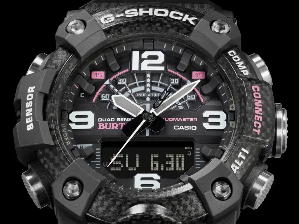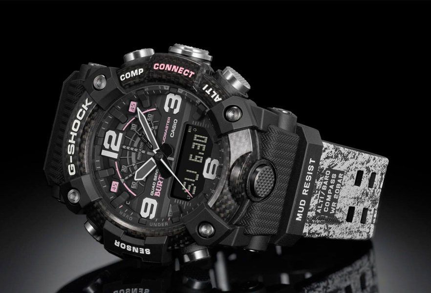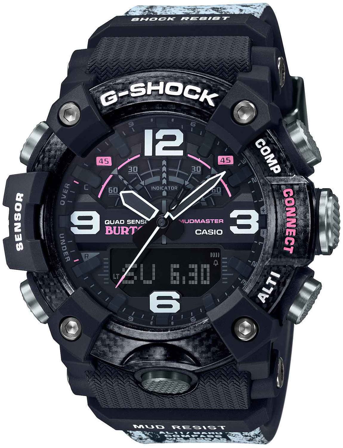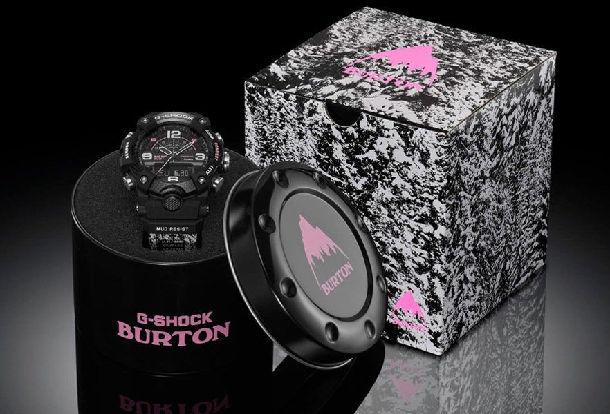 Перед вами яркая коллаборация 2020 года брендов G-SHOCK и Burton Snowboards. Для совместного творчества была выбрана модель из серии G-SHOCK MUDMASTER с черным корпусом, розовыми деталями и стильным принтом с паттерном зимнего леса на ремешке. Как свойственно всем коллаборациям, модель выпущена ограниченным тиражом и, вероятно, через несколько месяцев полностью разлетится по фанатам бренда. Не забываем про уникальный дизайн упаковки — такого вы не найдете на других моделях G-Shock!