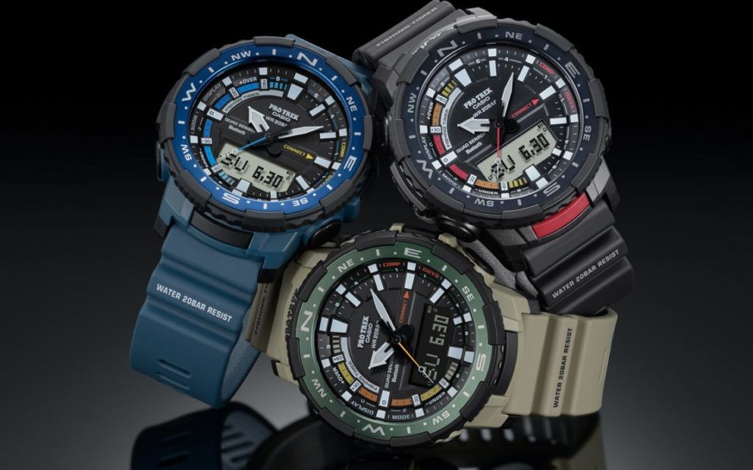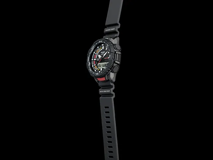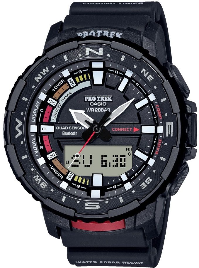 Новинка конца 2020 года! PRT-B70 вобрали в себя чуть ли не все необходимые возможности для аутдора — квадро-датчик [барометр/высотомер, термометр, цифровой компас, шагомер], время восхода/заката солнца в заданной точке, график лунных фаз, датчик приливов/отливов и таймер рыбалки [Fishing Timer].