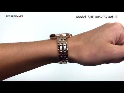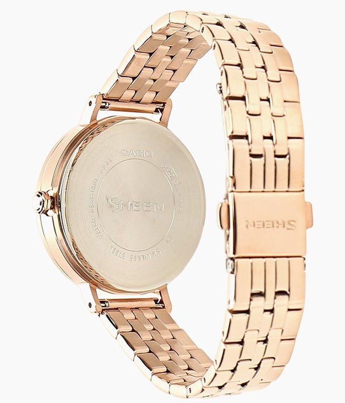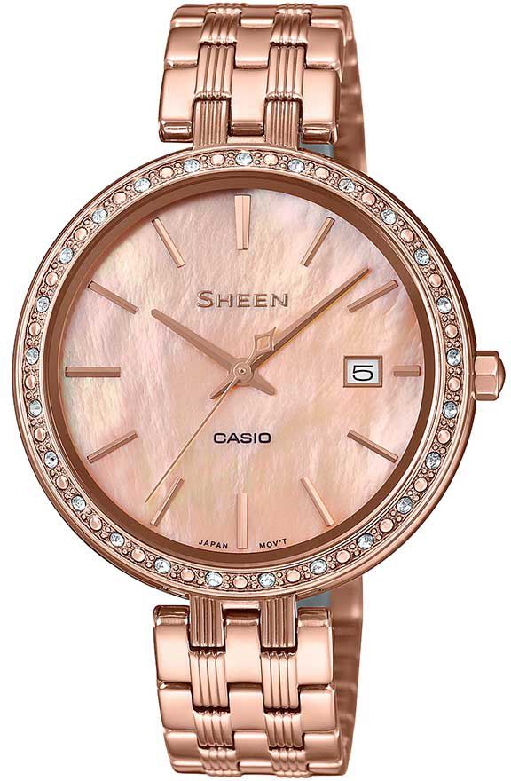 Стильная женская модель Casio Sheen из 4000-й серии в лаконичном дизайне выполнена из высококачественной стали с ионизированным покрытием цвета розового золота с перламутровым циферблатом и безелем, украшенным кристаллами Swarovski®.