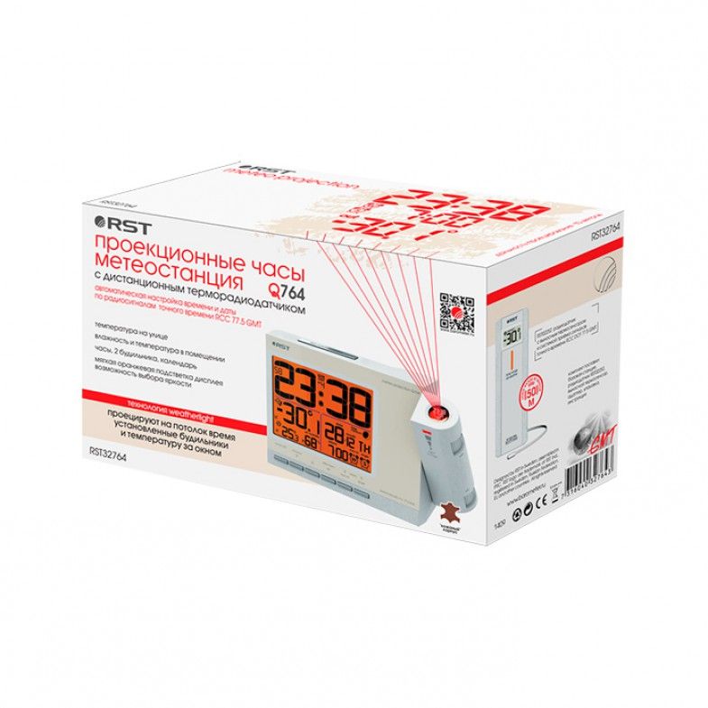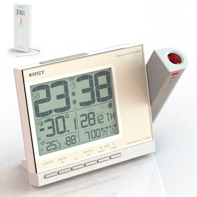Цифровые проекционные часы RST32764 (Q764) позволяют отобразить на стену или потолок в тёмное время суток комнатную температуру, текущее время и установленные будильники. Дальность проецирования до 10 метров.