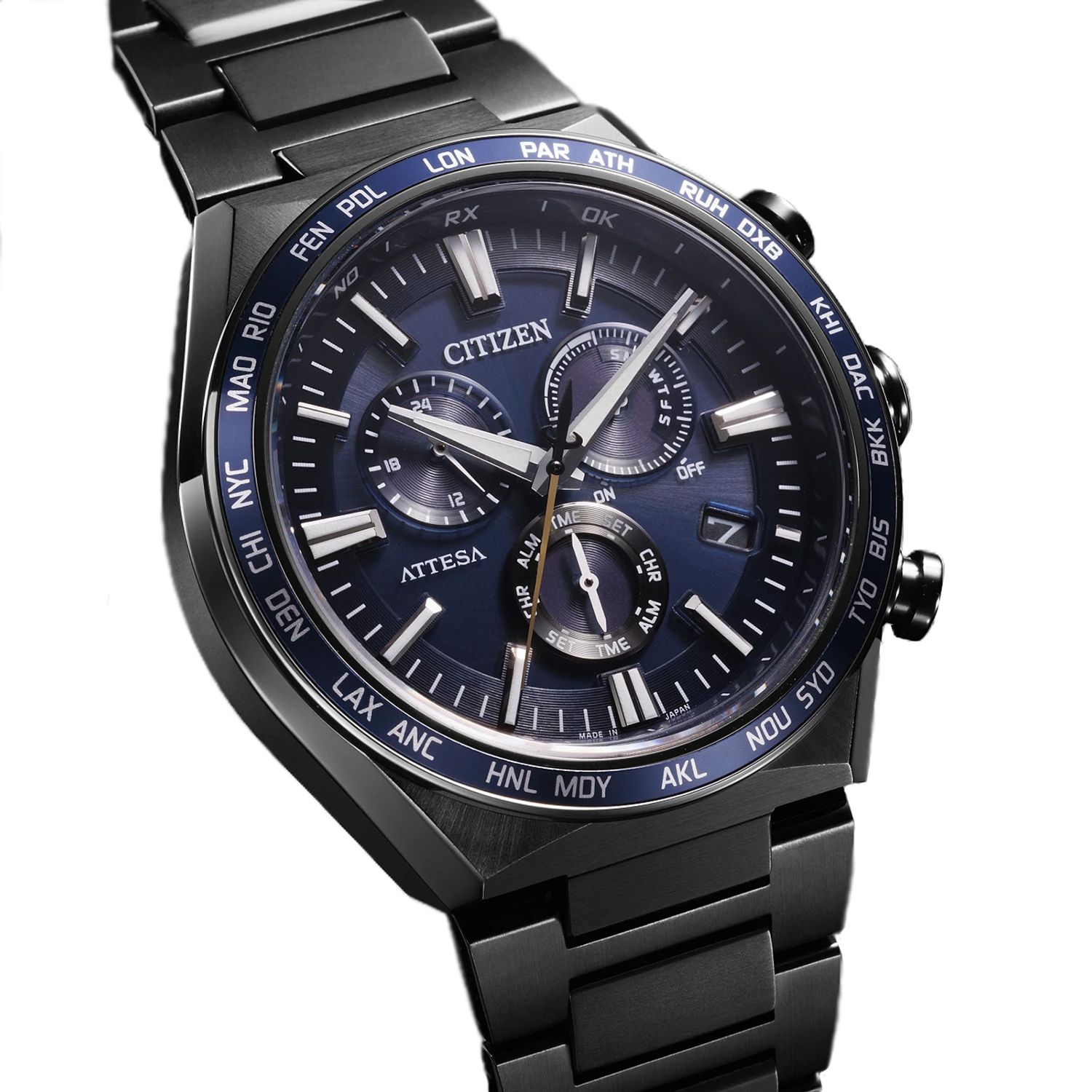 Три дополнительных субциферблата служат для отображения функций хронографа, уровня заряда, освещённости и мирового времени.