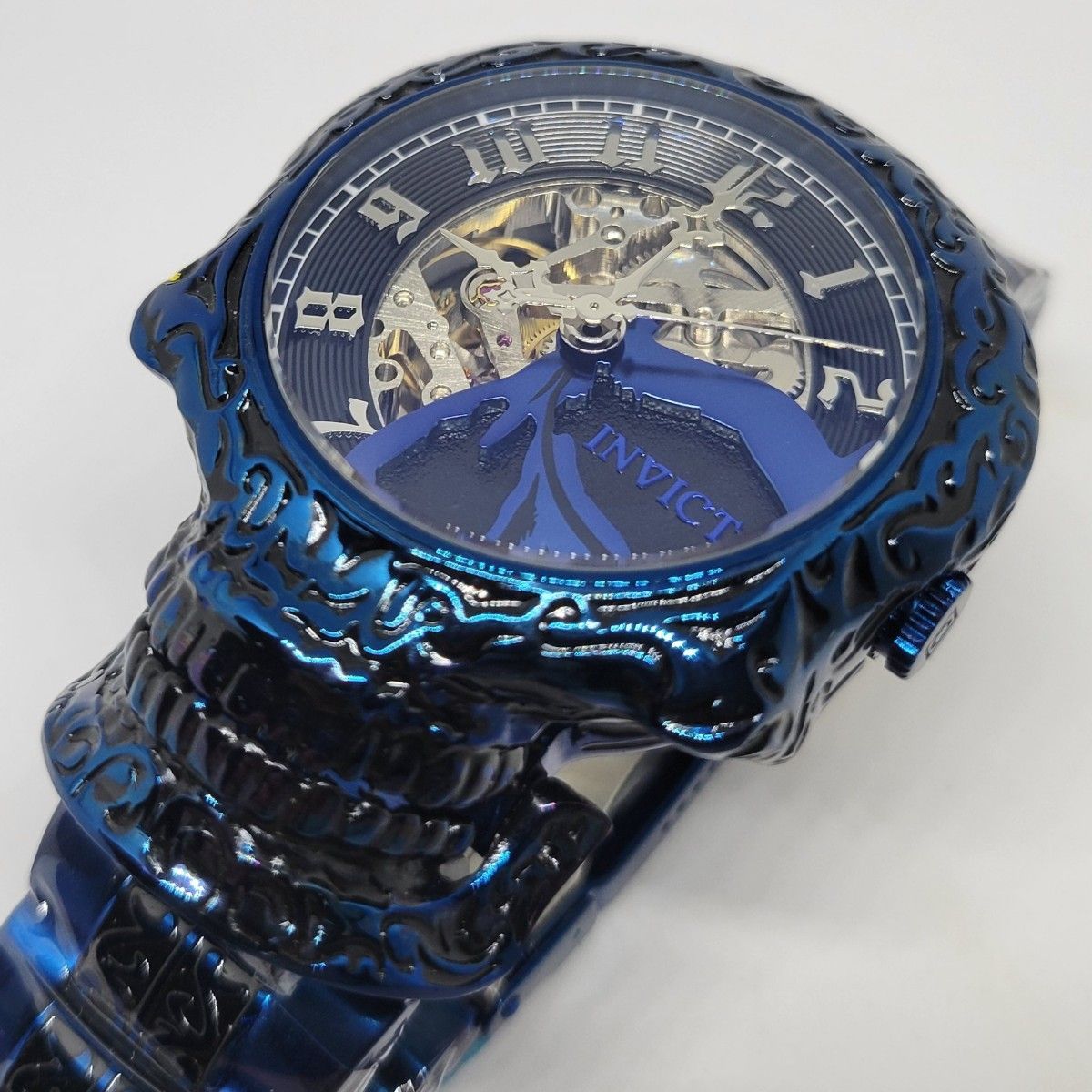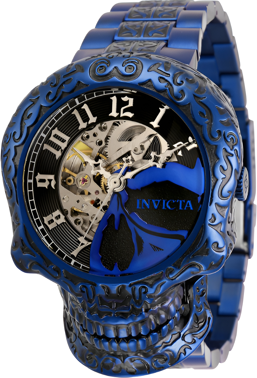 Корпус часов выполнен в виде черепа, нижняя челюсть подпружинена и подвижна. Скелетоны.
