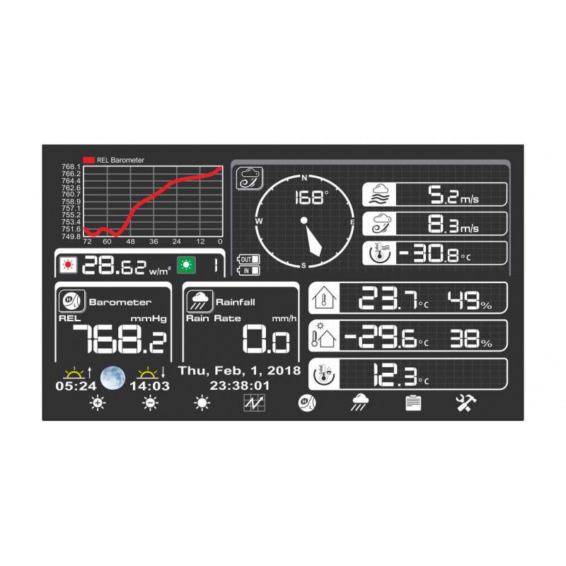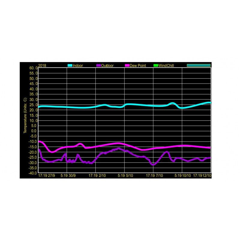 Метеостация записывает на внутреннюю и подключаемую память историю данных за несколько лет и отображает в цифрах и графически в реальном времени. Настройка и калибровка станции может осуществлятся с компьютера.