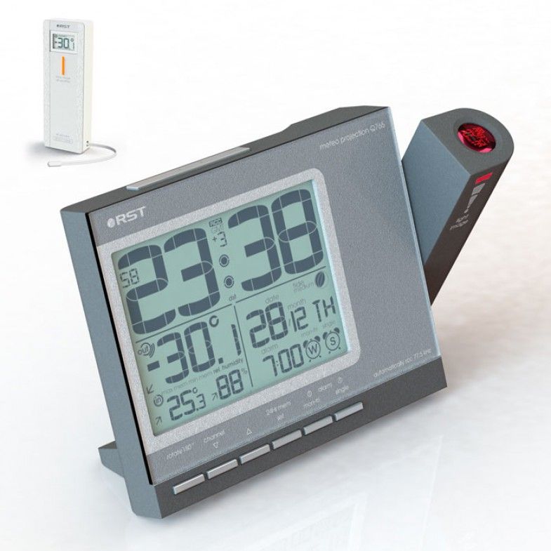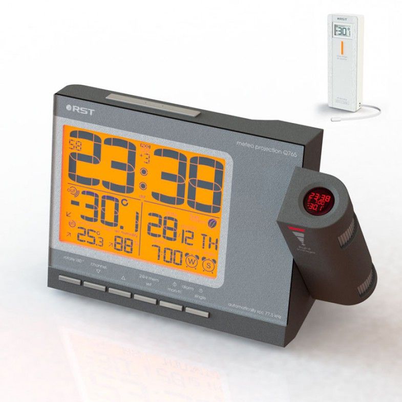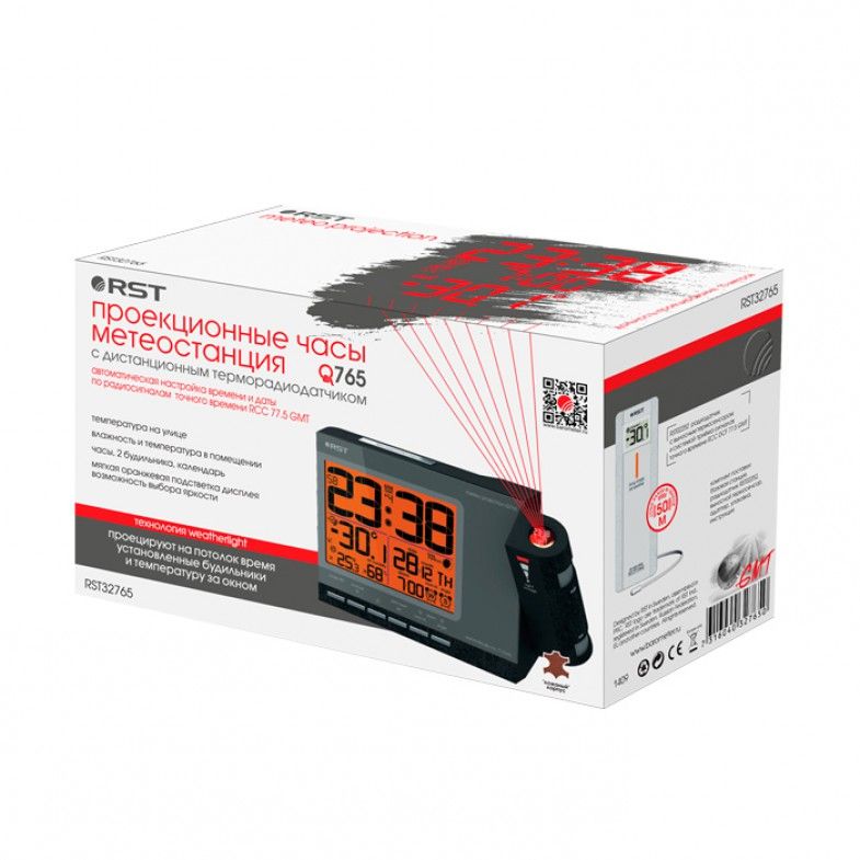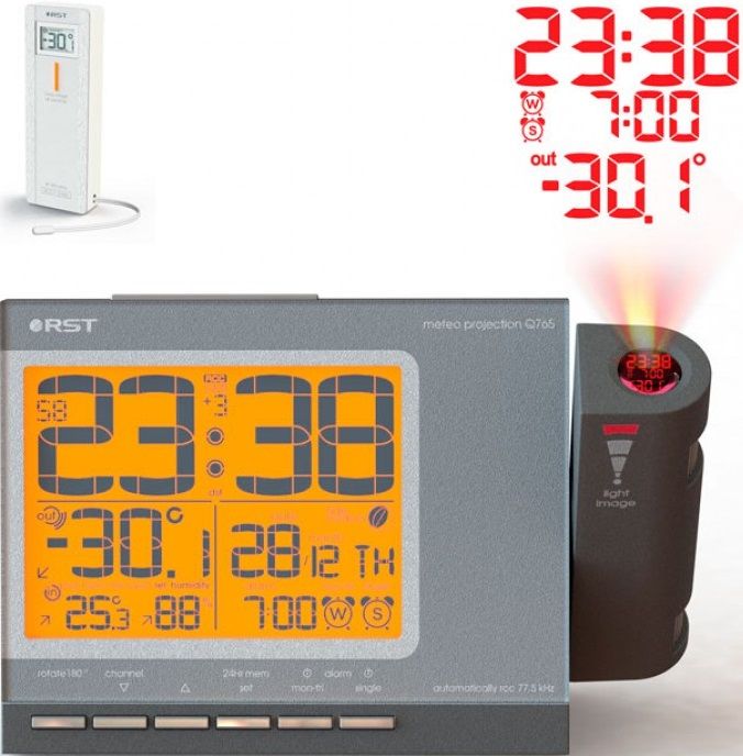 Цифровые проекционные часы RST32765 (Q765) позволяют отобразить на стену или потолок в тёмное время суток комнатную температуру, текущее время и установленные будильники. Дальность проецирования до 10 метров.
