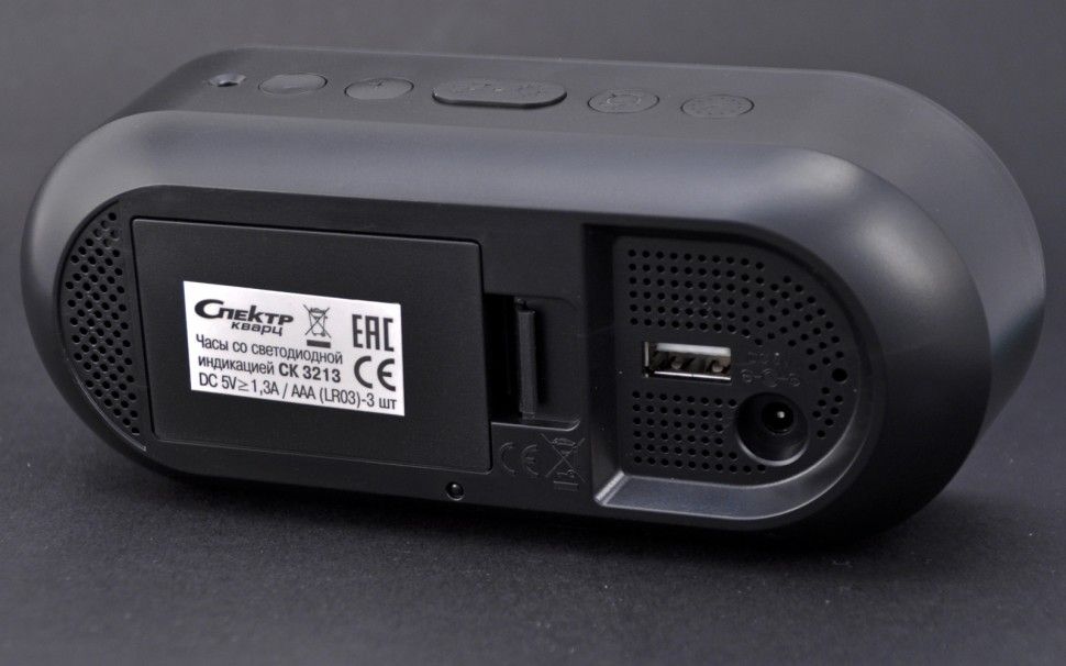 Имеется резервное питание от батареек тип R6(AA) x 3 шт. (не входят в комплект), используется для сохранения настроек времени и срабатывания будильника на случай отключения электричества. Корпус выполнен из пластика.