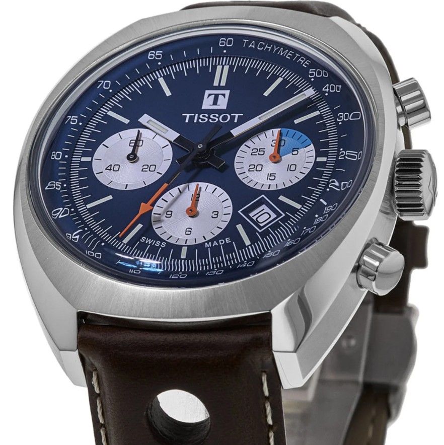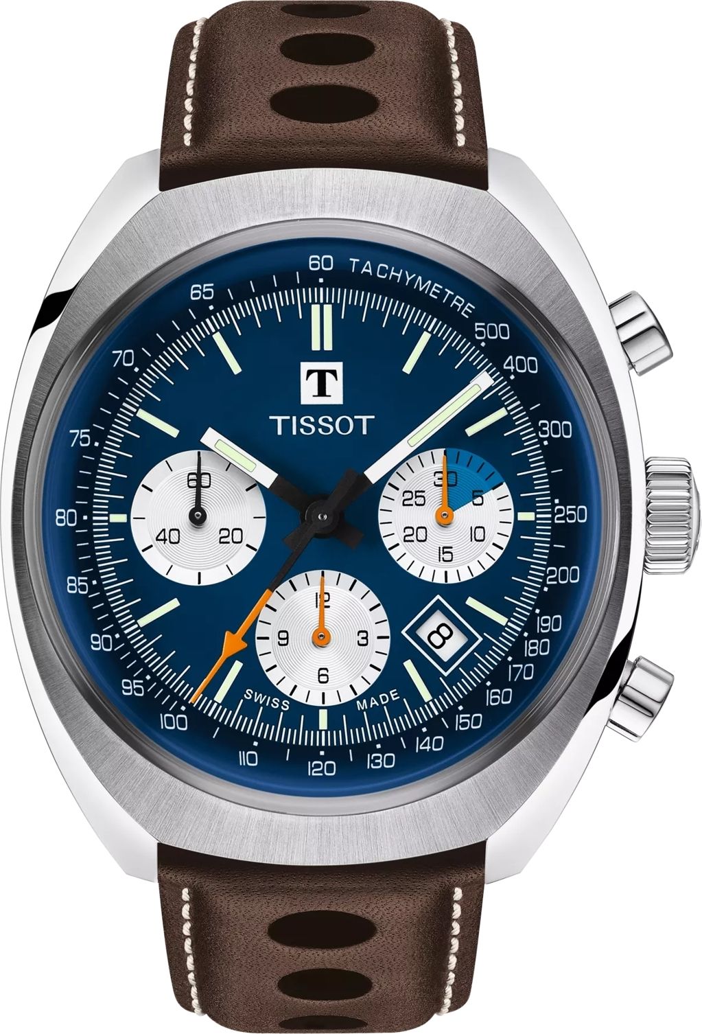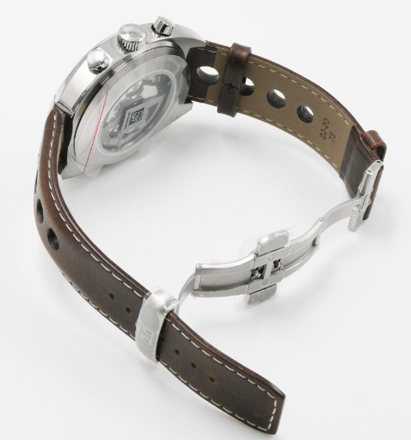 тахиметрическая шкала и ремешок из перфорированной кожи напоминает о рулях классических гоночных автомобилей.
